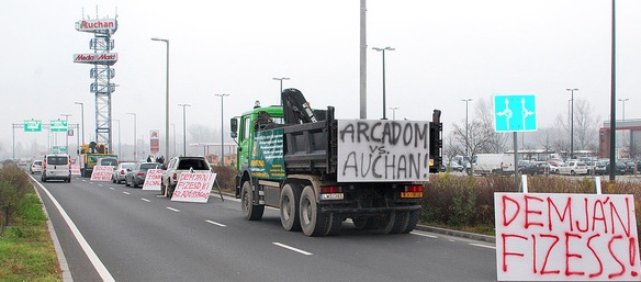 Tegnap az 52-es főút kecskeméti bevezető szakaszán mintegy 20 alvállalkozó képviselője félpályás útlezárással tiltakozott, amiért az Arcadom nem hajlandó kifizetni nekik körülbelül 300 millió forintot, melyet a kecskeméti Auchan Áruház rekonstrukcióján végeztek el.