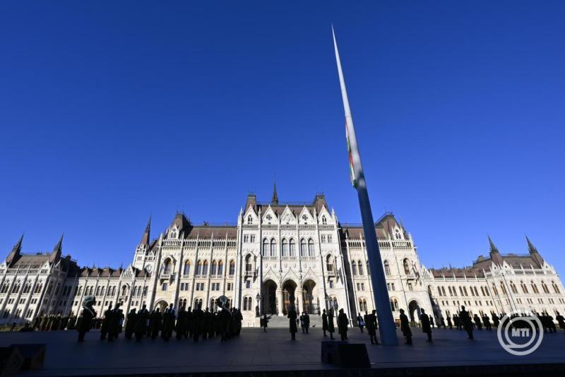 Katonai tiszteletadás mellett, Szalay-Bobrovniczky Kristóf honvédelmi miniszter, Böröndi Gábor vezérezredes, a Magyar Honvédség Vezérkar főnöke, Haslinger Rihárd alezredes és Zsolnai Tamás, a 32. Testőrezred díszegységének parancsnoka jelenlétében ünnepélyesen felvonták, majd félárbócra engedték a nemzeti lobogót a nemzeti gyásznapon, az 1956-os forradalom és szabadságharc leverésének, a szovjet csapatok bevonulásának évfordulóján kedden az Országház előtti Kossuth Lajos téren.