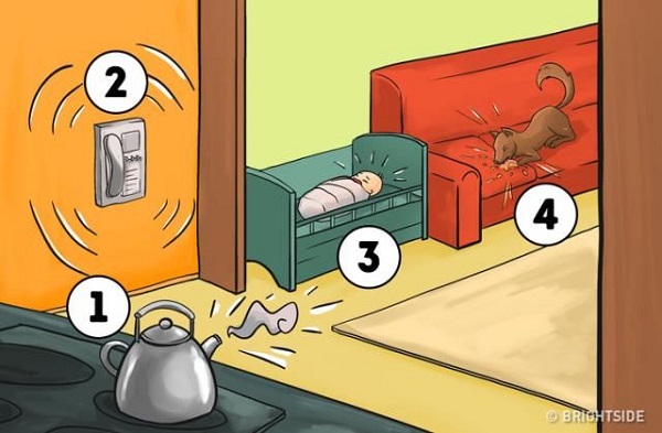 Képzeld el, hogy az alábbi képen látható szituációban lépsz be a lakásodba! Mit tennél először? Levennéd a teát a tűzről? Felvennéd a telefont? Megnyugtatnád a síró kisbabát? Kizavarnád a kutyát? Ha döntöttél, akkor olvasd el az ahhoz tartozó elemzést!