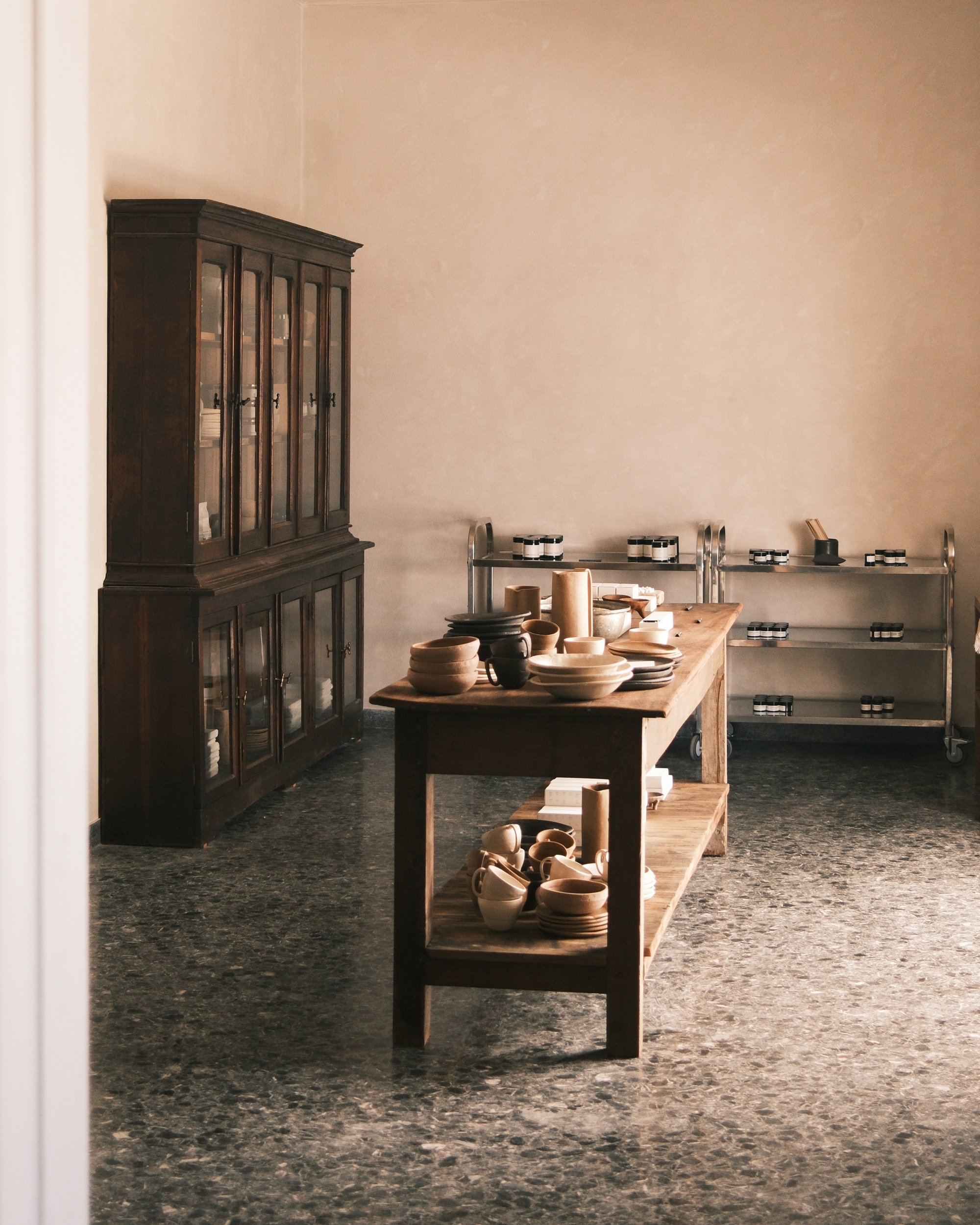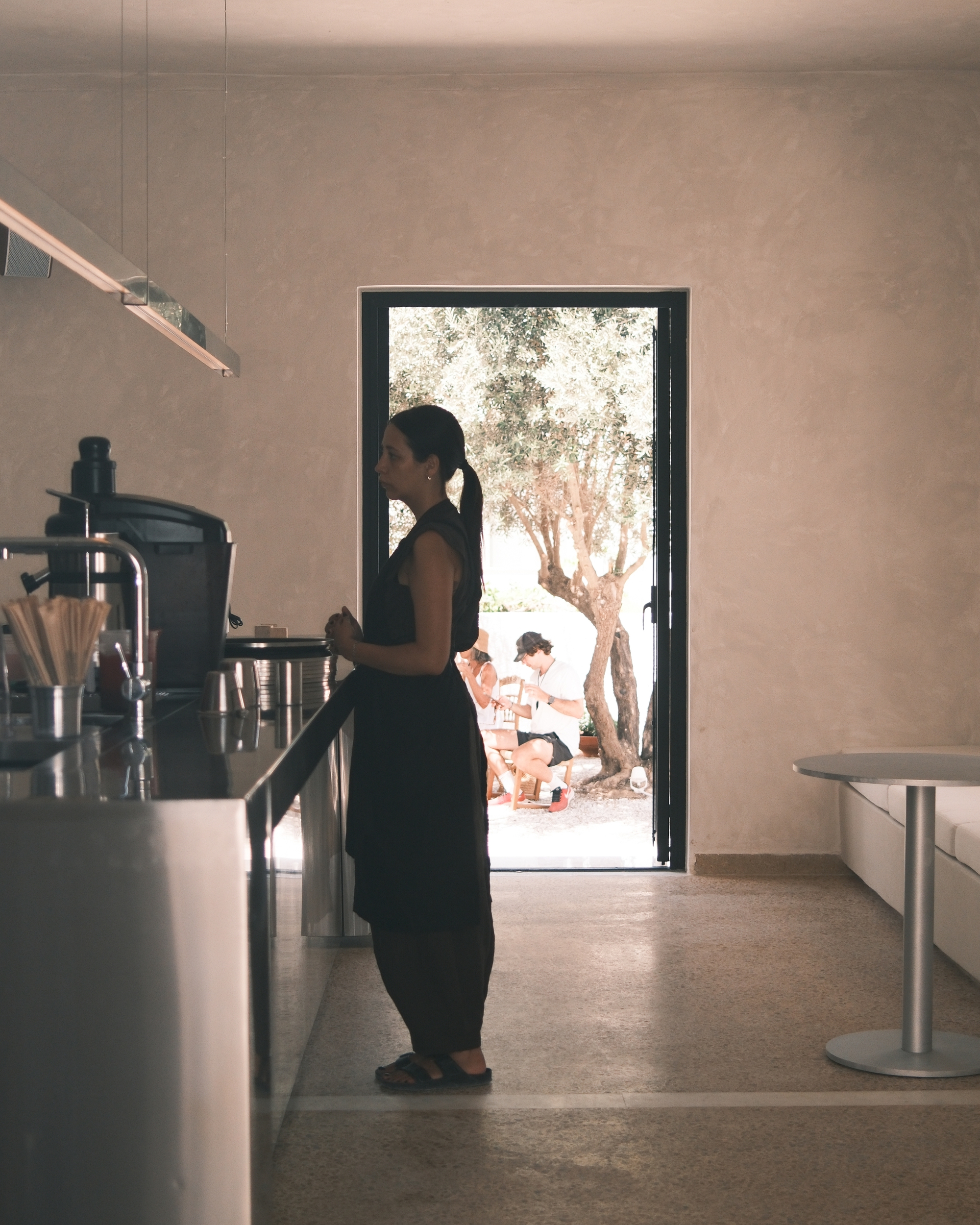 Az enteriőrben a nyers elegancia és a szigeti kézművesség ötvöződik. A mészfestett felületek, a kézzel készült kerámiák és a lebegő fa bútorok mind hozzájárulnak a nyugodt, mégis inspiráló atmoszférához. A térben minden elem gondosan megtervezett, hogy támogassa a lassú életmódot és a mindennapi rituálékat. A bútorok, melyeket Theodor Psychoyos tervezett, egyszerre tűnnek tartósnak és mozgathatónak, lehetővé téve a tér rugalmas használatát.