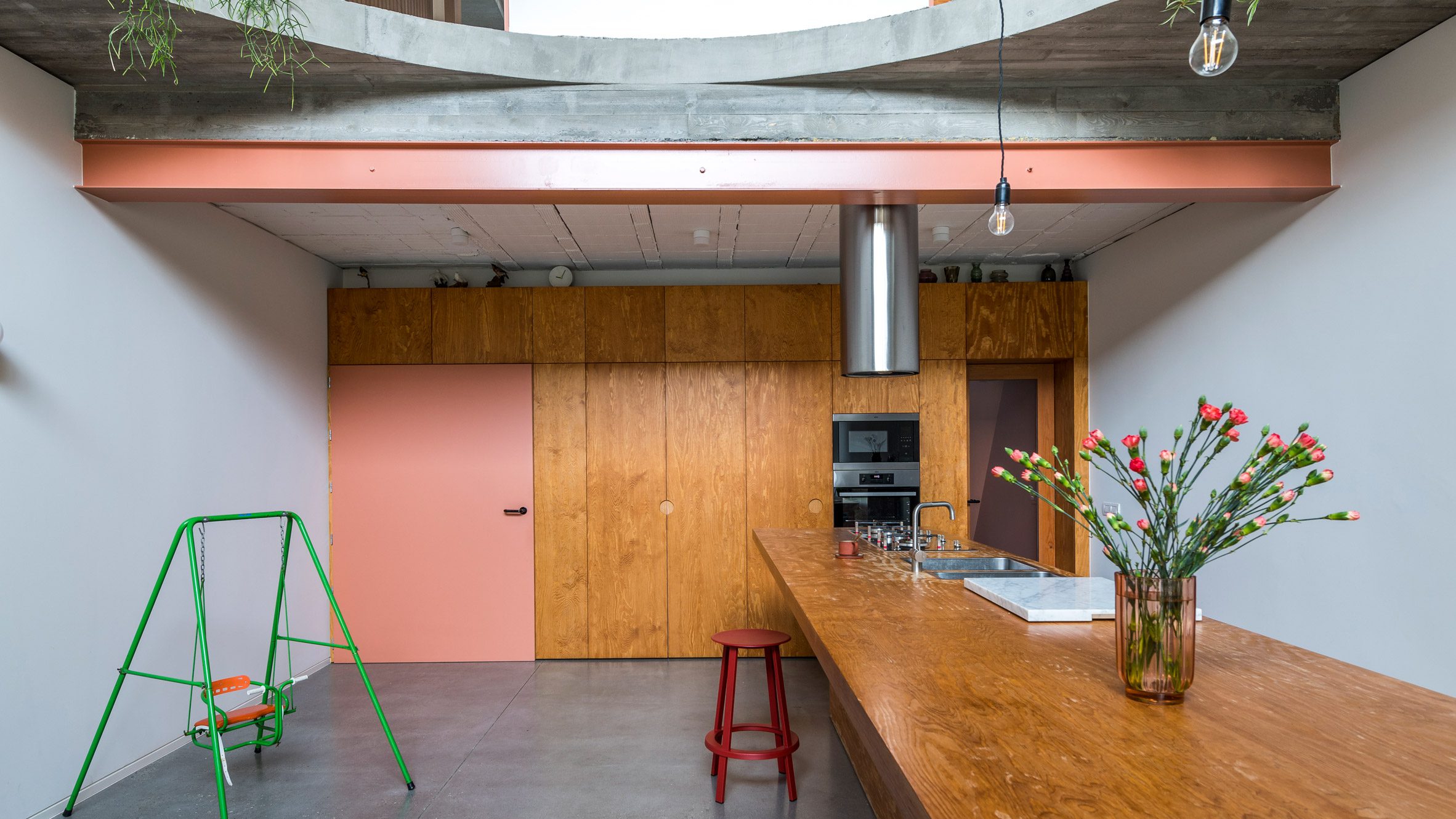 Ez szerkezeti és esztétikai kihívást is jelentett, mivel a betonlemez alátámasztja a meglévő ház nagy részét. Az épület értékes eredeti elemei, mint a lépcsőház, a szaniterek, a világítás, a szekrénypanelek a bontás során megmaradtak és új helyet kaptak a lakásban. A lépcsőház helyreállítása során előkerült az eredeti, helyszíni öntvénybeton, amit soha nem akartak láthatóvá tenni. A fa zsaluzat lenyomata azonban elbűvölte a tervezőket, és ezt a megjelenést megismételték az új betonban, így nem mindig egyértelmű, hogy mi az eredeti és mi az új. A Le Corbusier és Charlotte Perriand által tervezett Lumax üvegtömböket, amelyeket korábban elrejtettek, feltárták és restaurálták. Olvass tovább. Kattints ide!