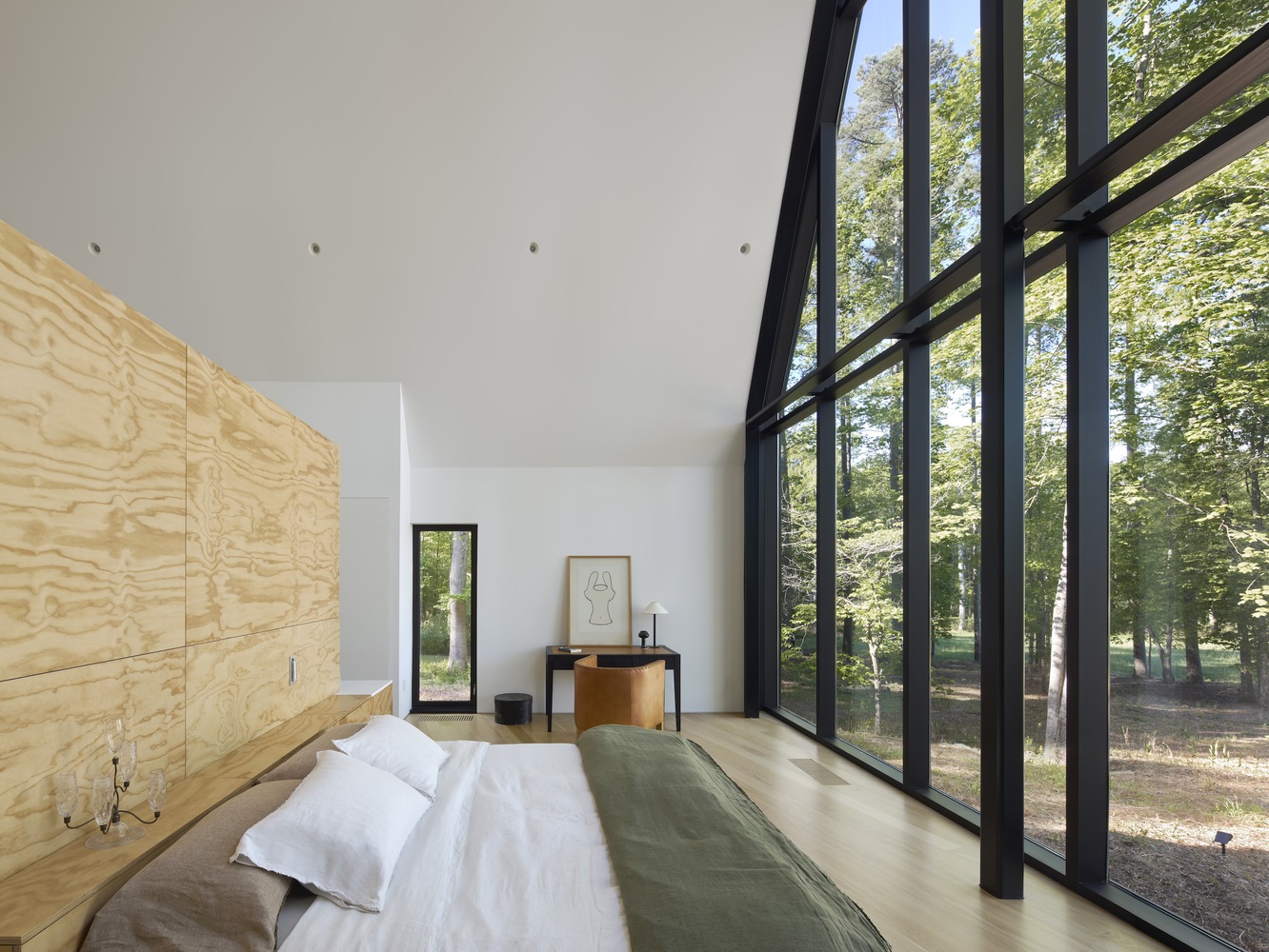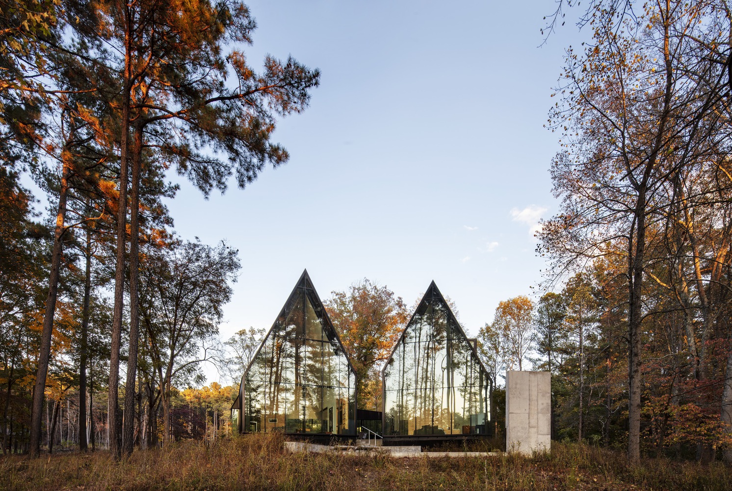 Az Appalache-hegység lábánál, az Eno folyó közelében, egy erdős, 65 hektáros területen található Steeplechase House a reflexió és a pihenés helyeként tervezték – a fák között kialakított pavilonnak, amely kapcsolódik a kiterjedt természeti környezethez. Az egyszerű dupla nyeregtetők 31 láb magasra emelkednek, és az üvegfelületek lehetővé teszik, hogy a természet vizuálisan kapcsolódjon a belső térhez, és segít mélyebb, értelmesebb megérteni a természetes és az épített környezet kapcsolatát.