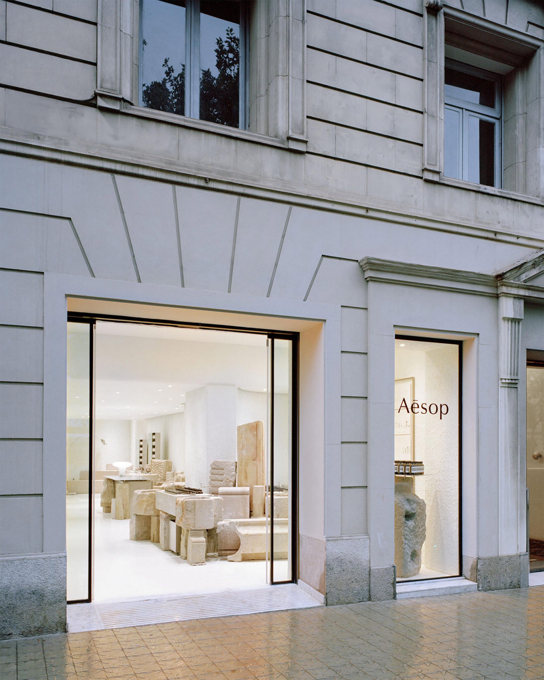 Az Aesop márka üzletének belső terében minden kődarabnak megvan a maga története: a mélyebb, kerek kövekből mosdókat, a szélesebb, lapos kövekből alacsony polcokat alakítottak ki az Aesop termékek számára. Mindezt a stúdió úgy rendezte el, hogy a tér természetes, barátságos hangulatot sugározzon, miközben a Montjuïc-kő jellegzetes vöröses, bézs és szürke árnyalatai a város építészeti identitását is tükrözik.