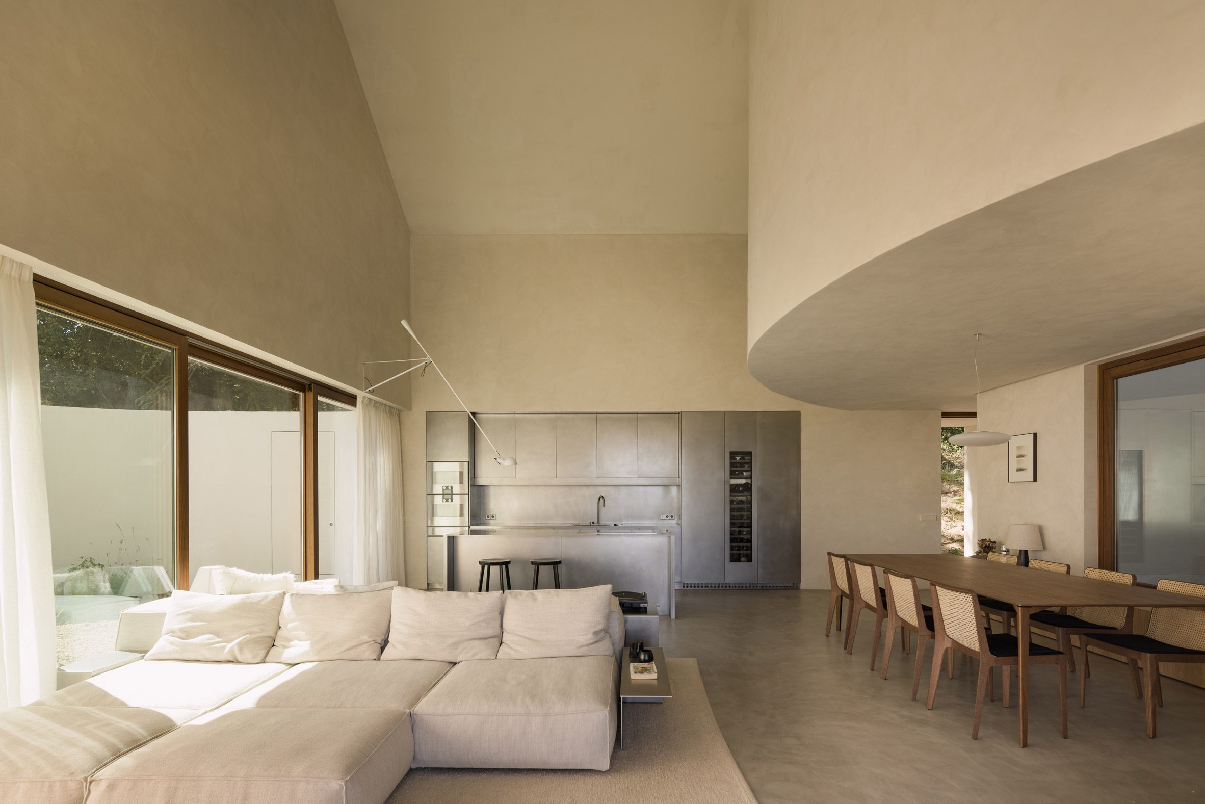 A földszinten elhelyezkedő nappali és hálószoba mindkét végén belső udvarokra nyílik, míg az épületet körülölelő vastag fal egyszerre szerkezeti elem és funkcionális „bútor”: elrejti a lépcsőt, a fürdőszobákat, valamint a beépített tárolókat és kandallót. A világos vakolt felületek és az íves formák finom feszültséget keltenek, miközben megőrzik az enteriőrök nyugalmát és tisztaságát. Olvass tovább. Kattints ide!