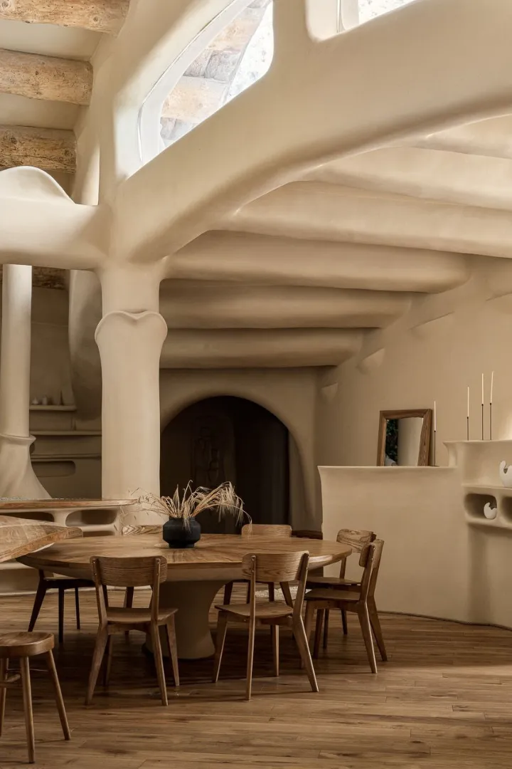 A ház tervezői éveken át finomították a formát: hullámzó falak, organikus áramlás jellemzi, nincsenek éles sarkok, terek egymásba folynak. Odalent a hegyoldalba simuló falak, fent lebegő zöldtető; belül helyi textilek, fa, természetes anyagok alkotják a hangulatot. Ez nem csupán esztétikai kísérlet, vályoggal épültek a falak, zöldtető fedi a tetejét, újrahasznosított anyagok és természetes textíliák szövik át a belsőt, mindez fenntarthatósági elkötelezettséget jelent, ami ma már több, mint trend.