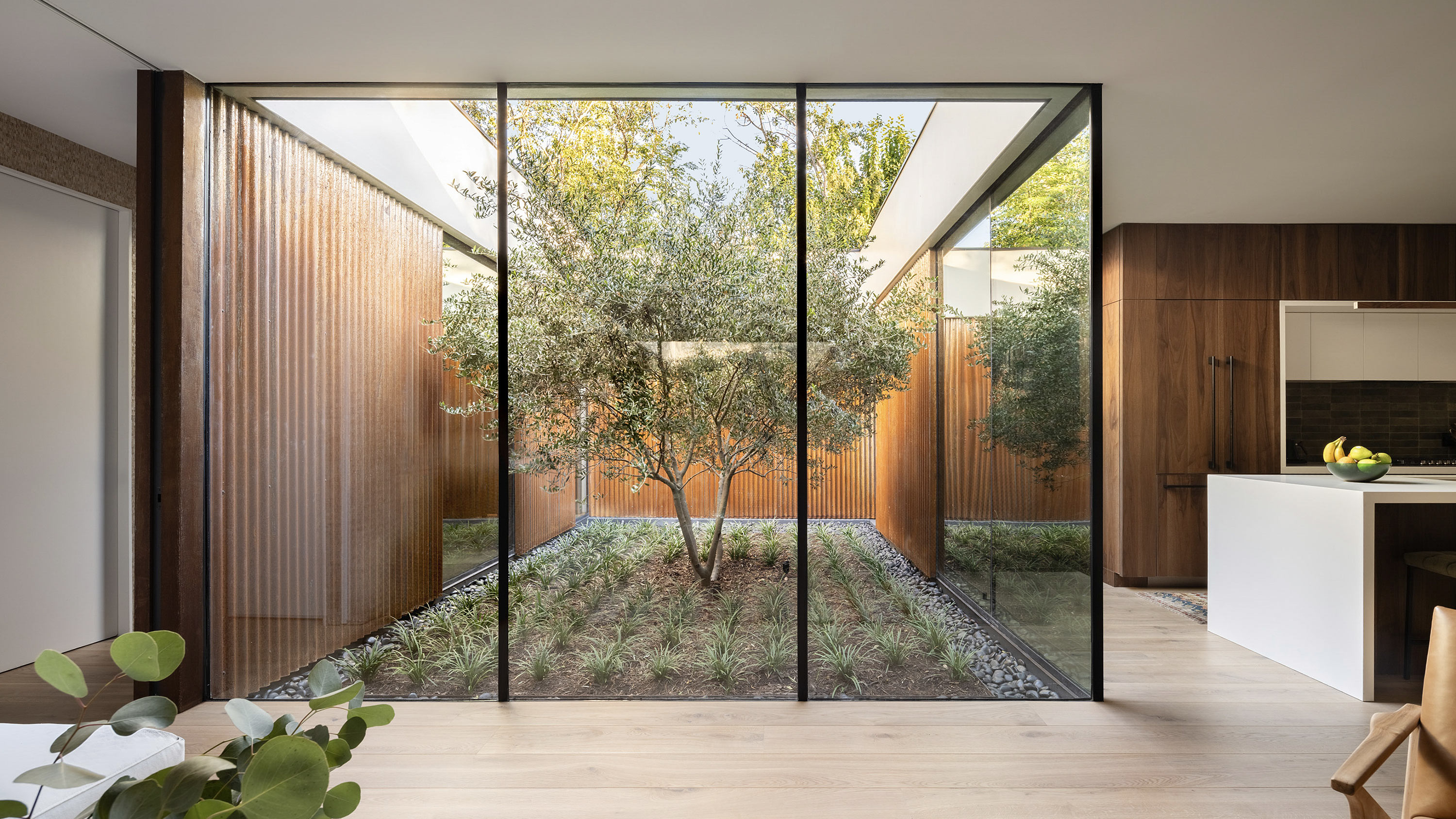 A fény és a természet jelenlétét nem a hagyományos üvegfelületek, hanem két belső udvar biztosítja: egy nagyobb, olajfával beültetett, valamint egy hosszabb, keskenyebb udvar, amelyekből a ház természetes fényt nyer. A tervezők inspirációt merítettek a római domusokból, a marokkói riadokból, a kínai siheyuanokból és a japán machiya-házakból, mind a belső kert felé fordított térszervezés jegyében.