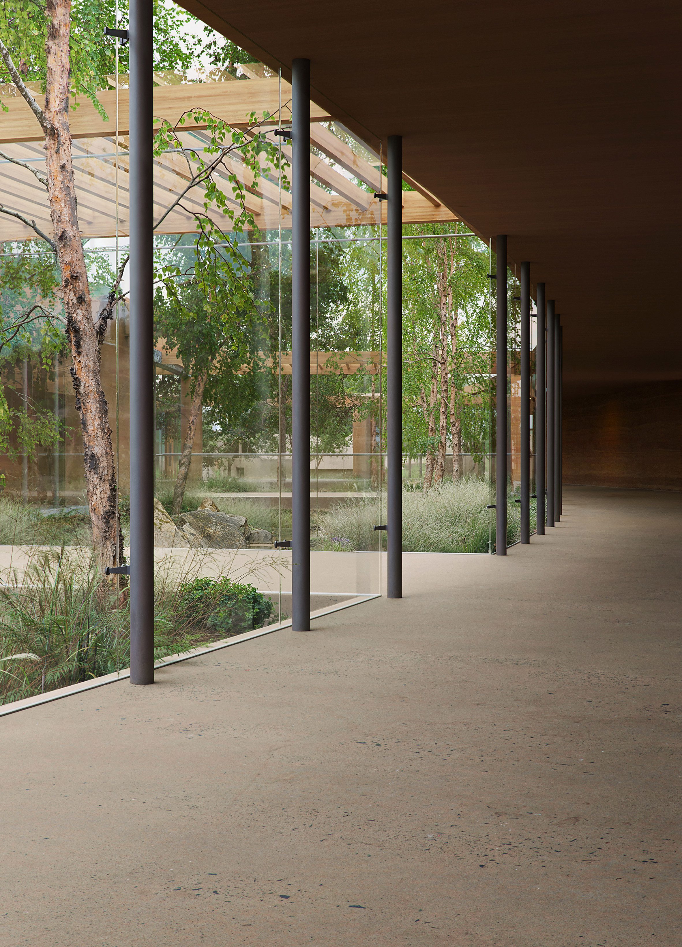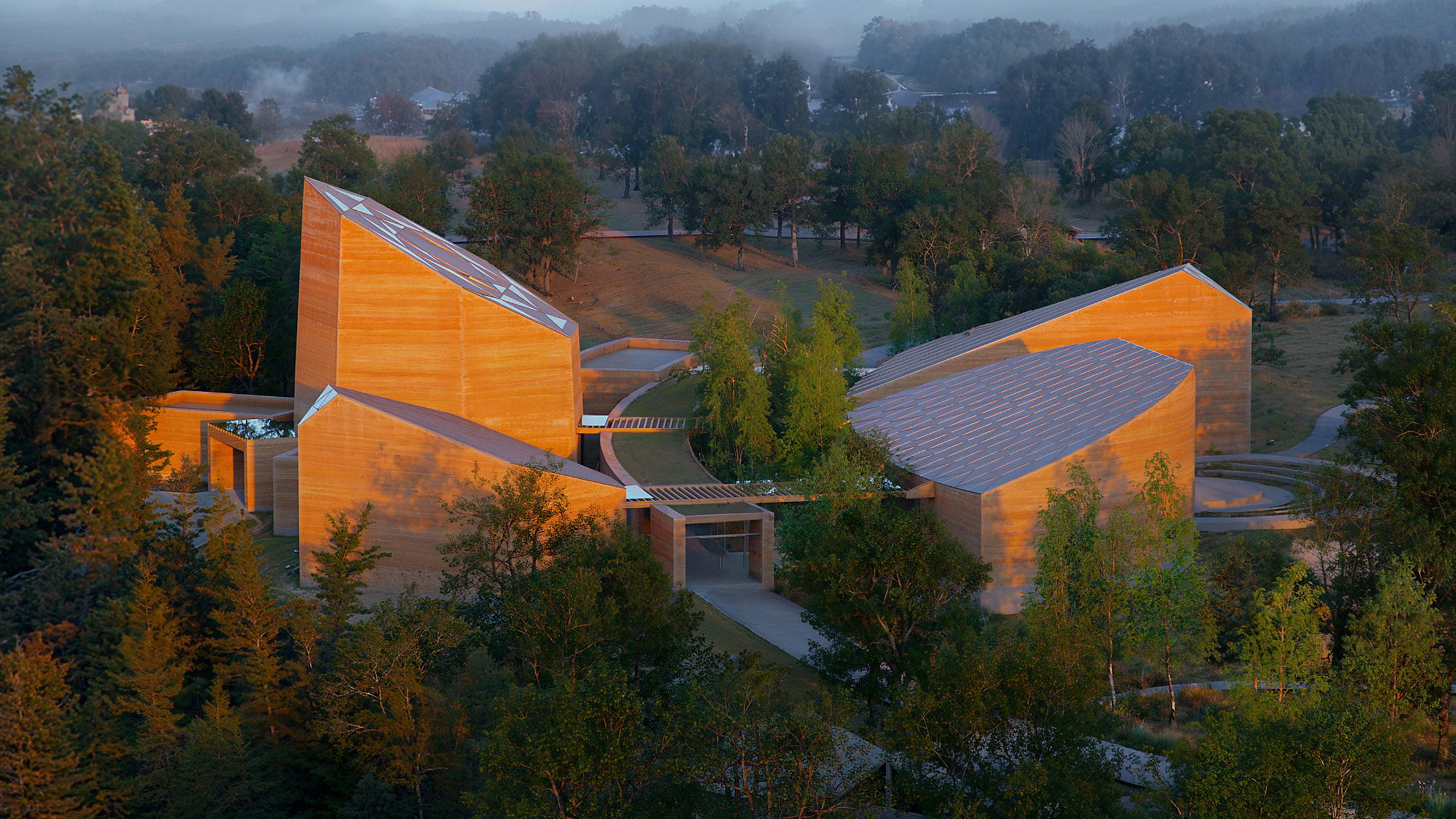A fák közé helyezett épületek, a köztük futó fedett útvonalak és hidak inkább egy bejárható térélményt hoznak létre, mintsem klasszikus intézményt. A kompozíció leginkább egy mesterséges kanyonra emlékeztet: a tömegek kifelé nyílnak, miközben a középső tengely végig vezeti a látogatót.