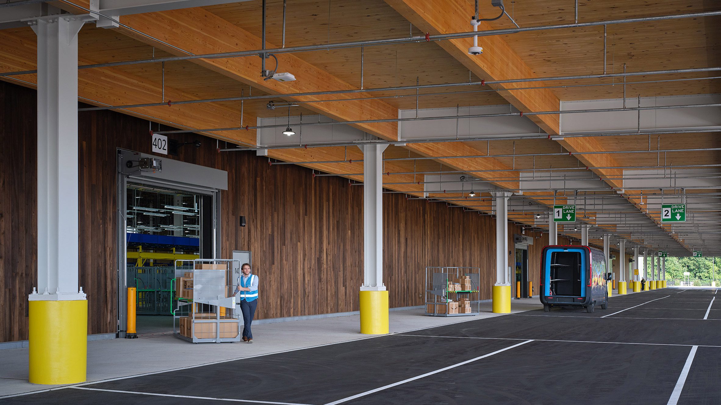 A ZGF Architects által tervezett, nagyrészt tömörfából készült épület új mércét állít az ipari létesítmények világában. A CLT-panelekből és ragasztott fatartókból felépülő szerkezet nemcsak a beépített szén-dioxid mennyiségét csökkenti, hanem a természetes fényre és az emberközpontú működésre is hangsúlyt helyez. A felülvilágító ablakok, a cirkadián világítás és az elektromos töltőállomások mind azt a célt szolgálják, hogy a raktár működése egyszerre legyen hatékony és környezettudatos.