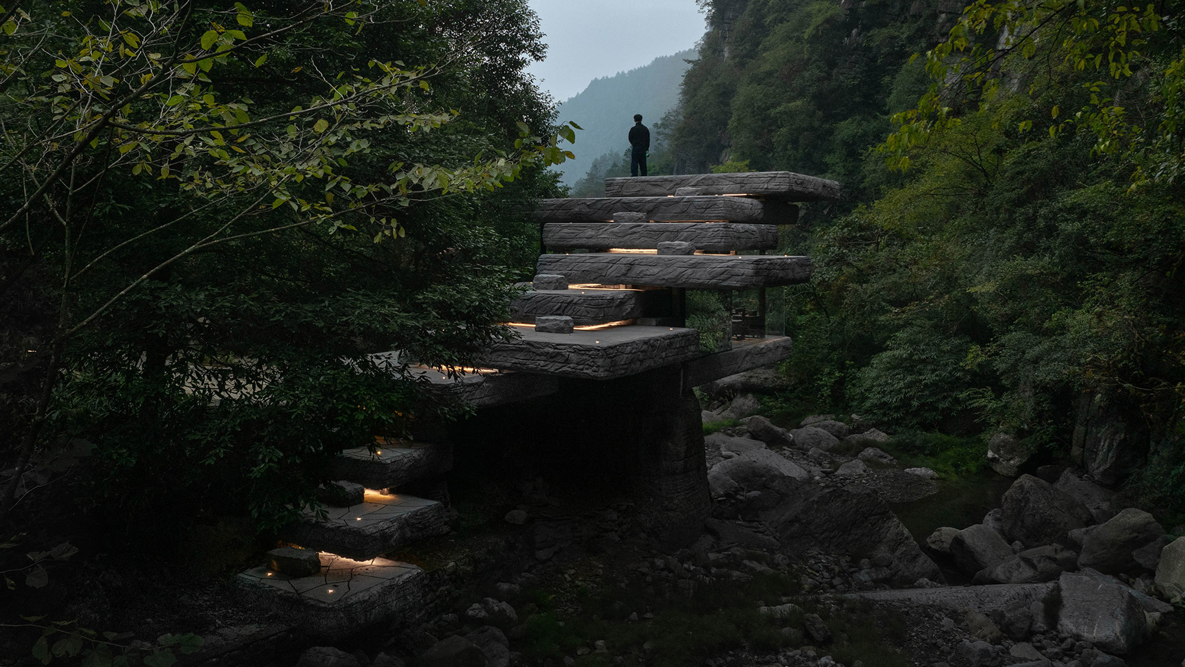 A DoDesign bemutatja a Drifting Stones: The Stacks & The Hut című szobrászati installációt a kínai Chongqing hegyeinek egy völgyében. Egy halmozott kőlépcső és egy kőpavilon alkotja ezt a projektet, amely egy magánlakáson belüli meditatív visszavonulásnak készült. Ez a két építészeti elem költői párbeszédet folytat a környező sziklákkal, patakokkal és sziklákkal.