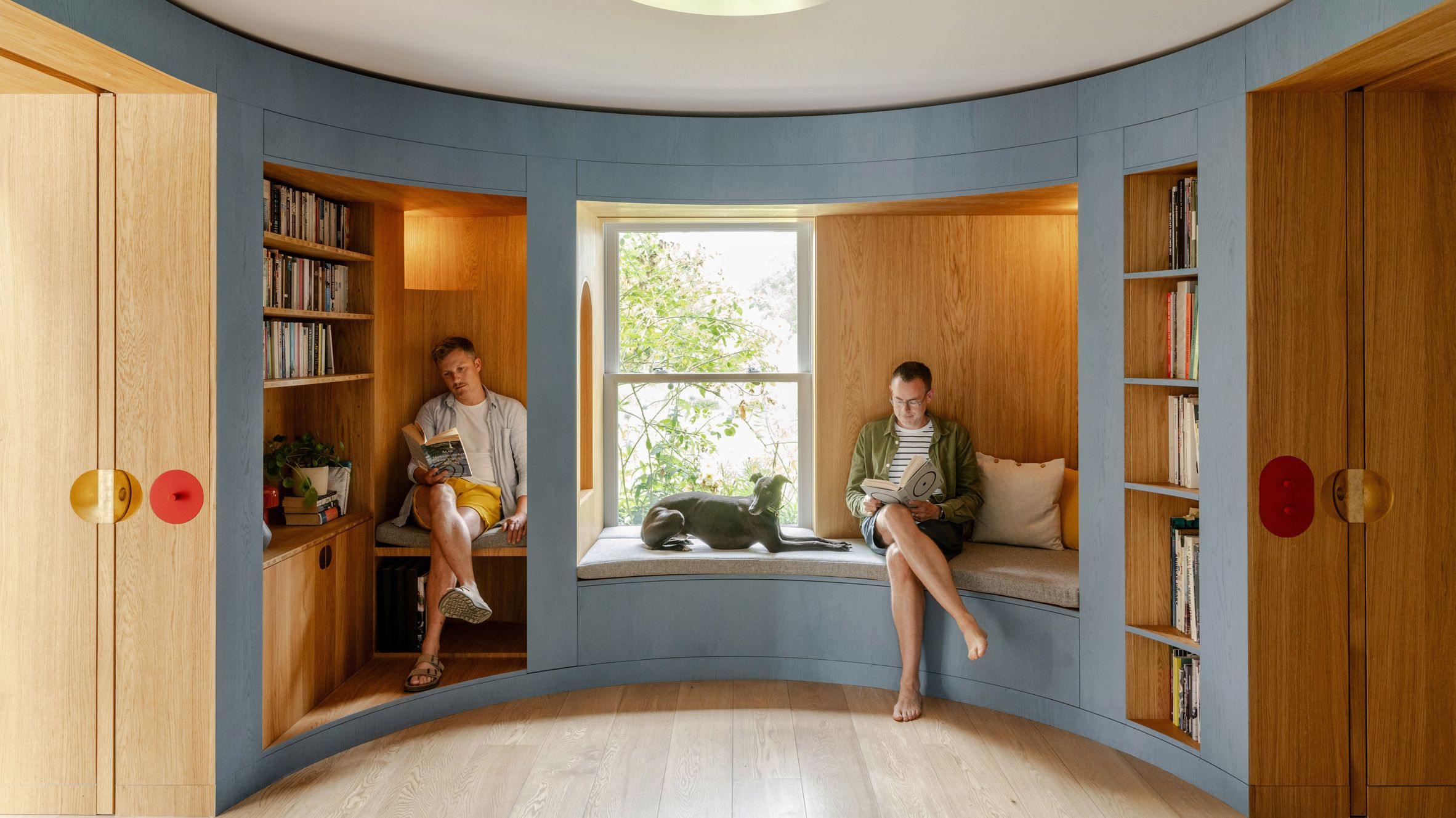 Az átalakítás központi eleme a ház szívében kialakított, íves falú, tölgyfával burkolt könyvtár, amely egyszerre funkcionál olvasótérként és vendégfogadó helyiségként. A tér szoborszerű kialakítása és a rejtett funkciók, például a falburkolatba integrált bárszekrény – a ház mindennapi használatát játékos, mégis kifinomult módon gazdagítják. A belső tereket élénk, mégis kiegyensúlyozott színpaletta köti össze, amely a természetes anyagokkal tudatos párbeszédet folytat. A kék, sárga, vörös és zöld részletek a különböző helyiségekben markáns karaktert adnak, miközben a fa, a beton és az újrahasznosított tégla anyagszerűsége megőrzi az épület autentikus atmoszféráját.