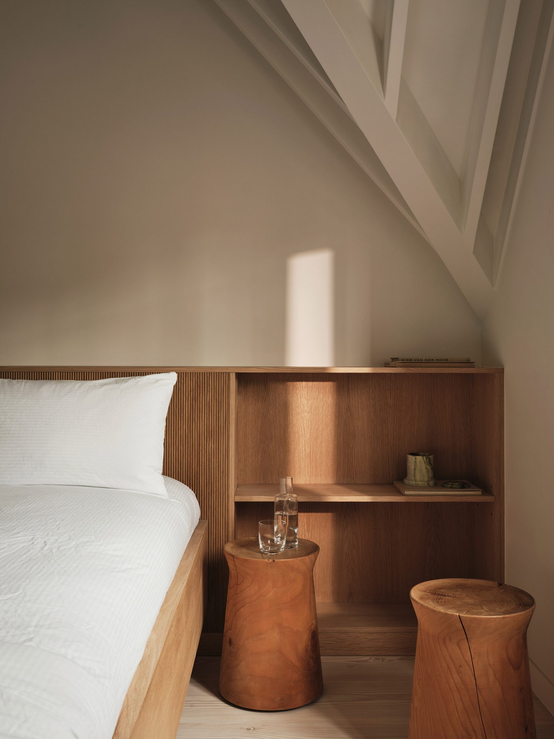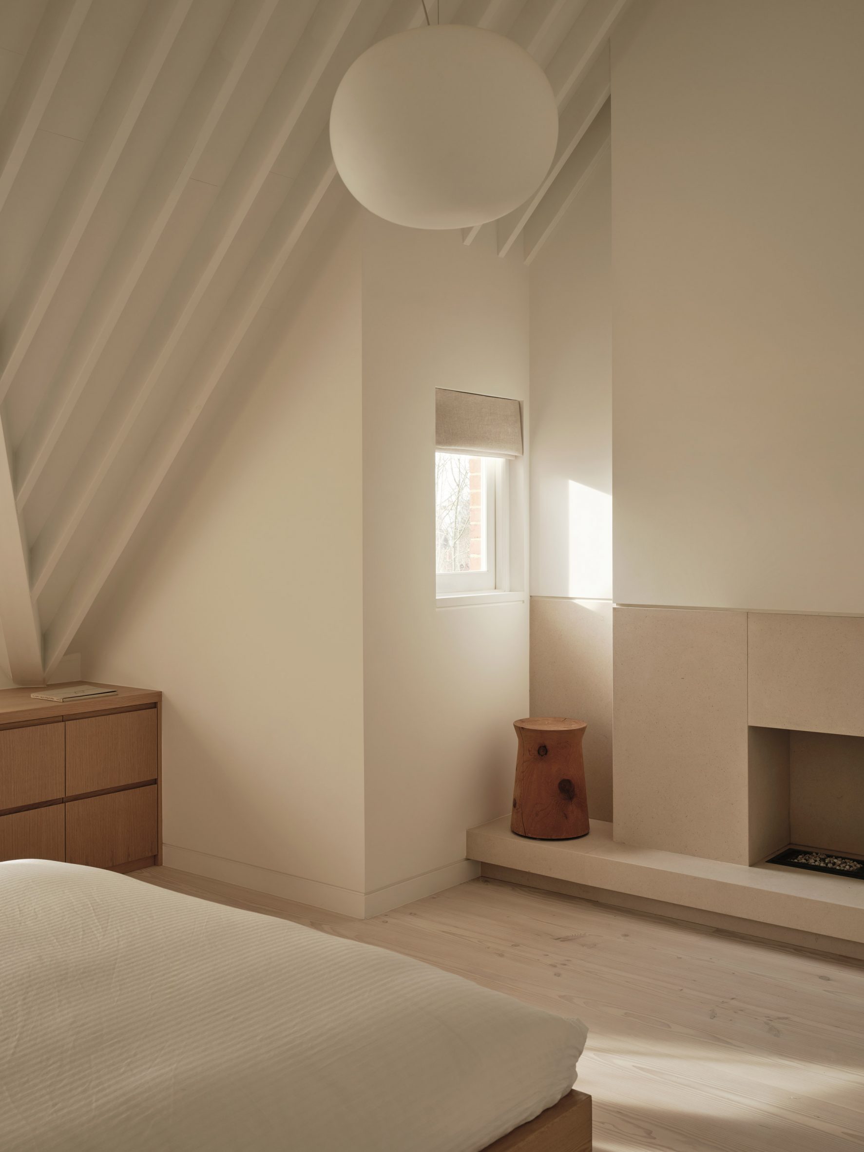 A tervezők a szomszédos tetők közötti rejtett „völgyet” használták ki, hogy egy teljesen új, dinamikusan hullámzó tetőszerkezetet hozzanak létre. A helyenként 4,8 méteres belmagasság monumentális, mégis légies atmoszférát teremt: a tér hol felfelé tör, hol visszahúzódik, intimebb zónákat formálva. Az eredmény egy olyan lakás, ahol a fény, a légtér és a forma folyamatos párbeszédben áll egymással.