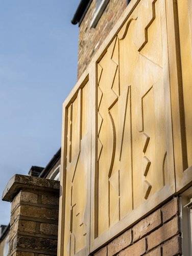 Az alsó szintre egy visszafogott méretű, mégis látványos, háromszintes toldalék került, amely nagy tolóajtókkal kapcsolódik a kerthez. A toldalék külsejét a megrendelő, Leona Clarke mintájára készült napsárga betonfríz teszi egyedivé. Az ovális mintás képet a viktoriánus előttezetek inspirálták, és fokozatosan sötétedik az idő vasfoga nyomán. Az új belső elrendezés során az étkezőt és a konyhát az emeleti részre helyezték át, így a ház központja világosabb lett, és a kerti kilátás is szabadon kihasználható lett. A központi szerepet kaptak Douglas-fenyőből készült elemek – korlátok, ablakkeretek, padlóburkolatok – amelyek egységes vizuális szálat adnak az egész térnek.