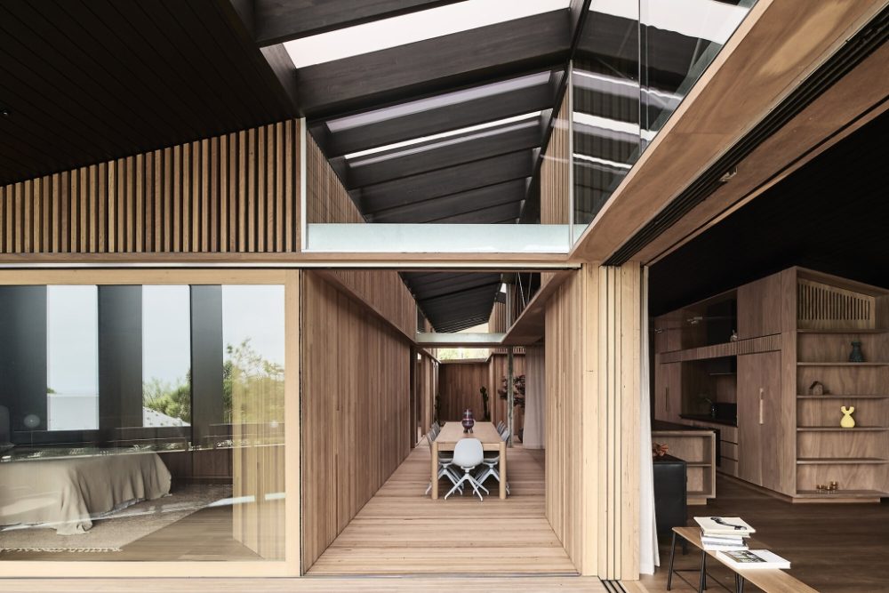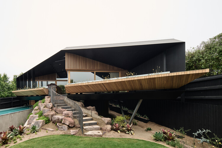 Mintha lebegne a Victoria állambeli Mount Martha tengerparti tájában: a Kross House acélszerkezete a sziklához rögzítve szinte a levegőben függeszti fel az épületet. A Figr Architecture Studio által tervezett látványos lakóház alaprajzi rendszerében az egyik szárny kizárólag a vendégek számára készült, a másik a házigazdák privát tereit foglalja magában. A befelé fordulás és a nyitottság közötti kifinomult egyensúly egyetlen, harmonikus építészeti gesztusban teljesedik ki.