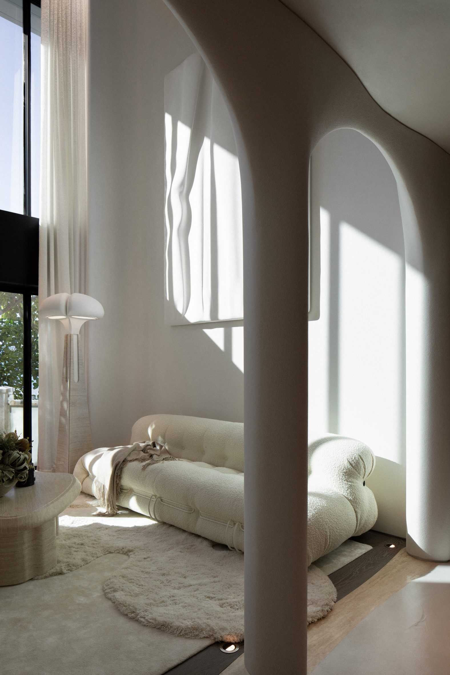 Az alsó szintek közösségi tereit összekapcsoló, egymásra rétegzett ívek dinamikus térkapcsolatokat hoznak létre, míg a sötét kőburkolatú konyha oltárszerű márványszigete erőteljes vizuális fókuszpontként működik. Ez az otthon bizonyítja, hogy a kortárs belsőépítészet képes egyszerre személyes, inspiráló és mélyen jelentéssel teli tereket létrehozni. Ha szeretnél többet tudni, kattints ide a teljes cikkért!