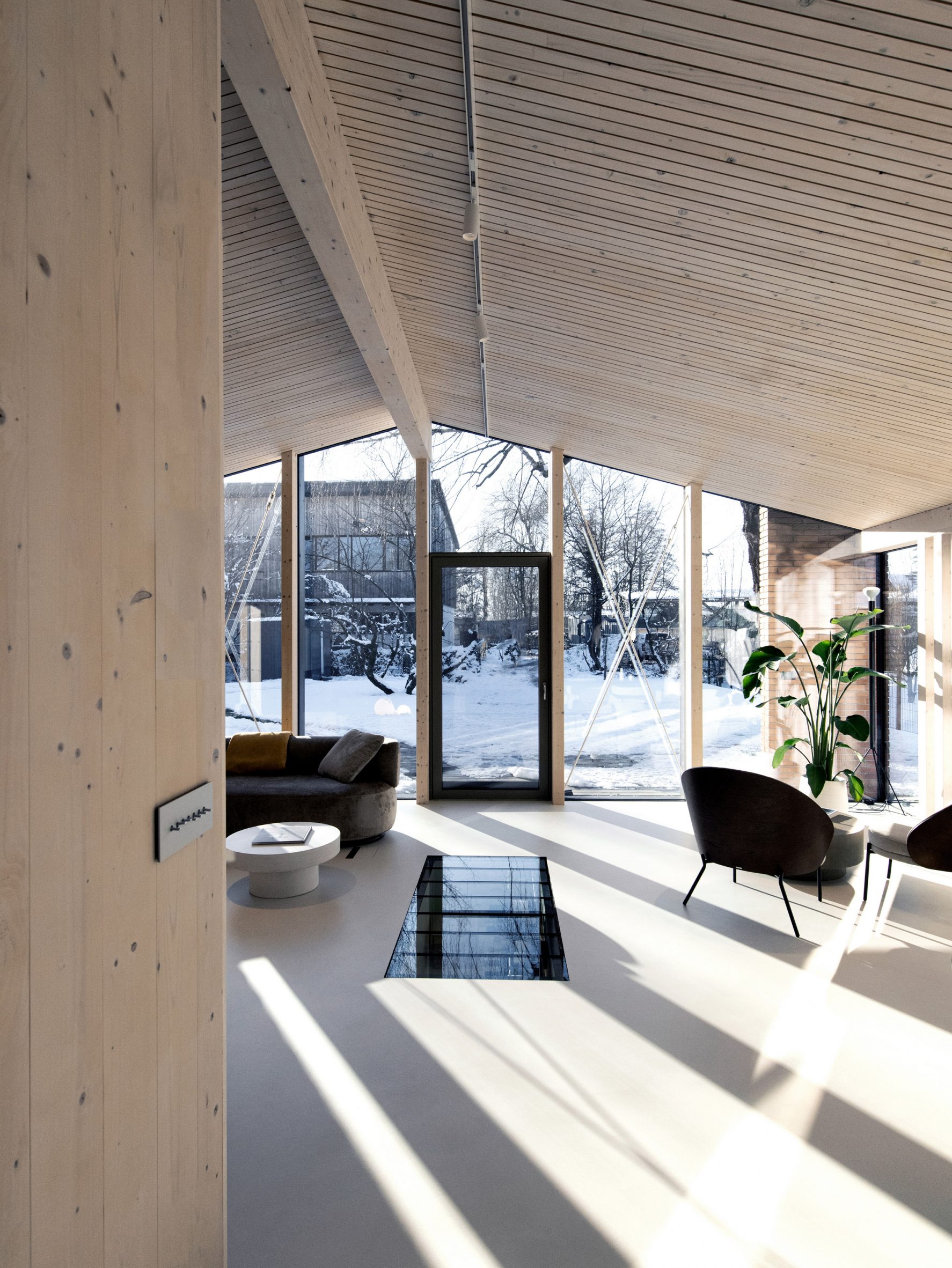 A belső terek meleg és időtlen hangulatot sugároznak: világos fa burkolat, üveglapos sétálható felület, falfülkébe épített kandalló, valamint a fő hálószobához vezető szintek teszik különlegessé az otthont. A stúdió kombinálta a hagyományos anyagokat a kortárs megoldásokkal, így az átlátszó bővítés és a faanyag harmonikusan illeszkedik a környezetbe, megőrizve a telep kulturális és táji értékeit.