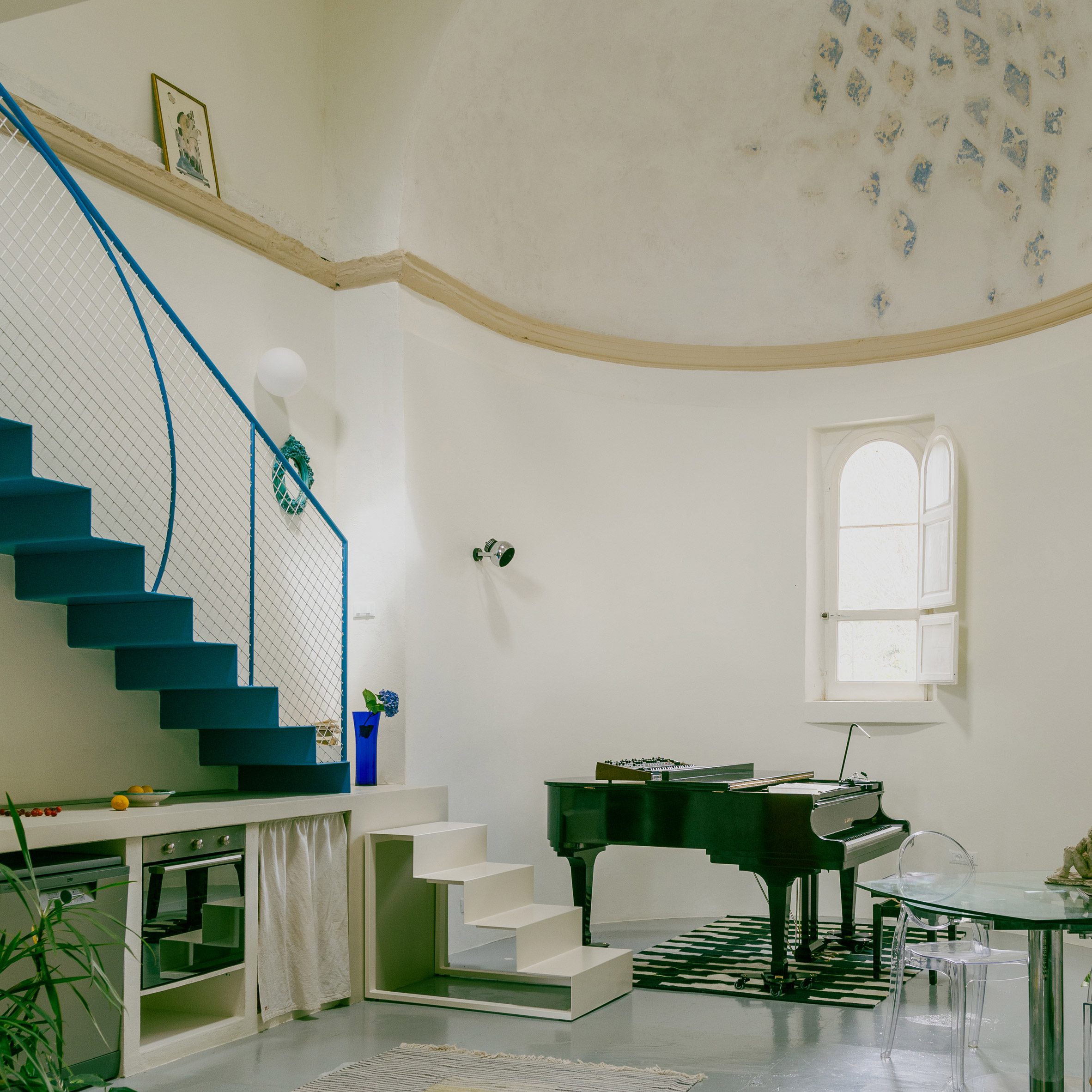 A projekt nem fed rá és nem töröl el semmit; inkább elvonással dolgozik, megengedve, hogy a hajó kétszintes belmagassága megtartsa csendes monumentalitását. Az új beavatkozások, mit az égszínkék vaslépcső, a konyhát és fürdőt magába foglaló funkcionális „szalag”, valamint a szentélyre néző fa galéria önállóságot adnak, miközben sosem bontják meg az összhangot a meglévő szerkezettel. A lépcső égszínkék árnyalata párbeszédet folytat a fennmaradt freskótöredékekkel, így a múlt nyomai kortárs gesztussá alakulnak, mely könnyedséggel tölti meg a teret.