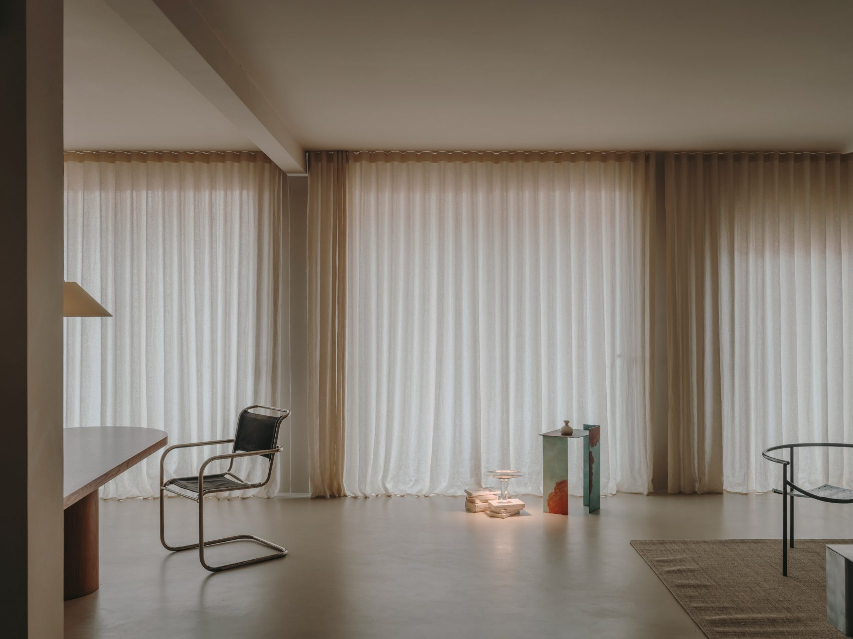 Az eredetileg apró, falakkal osztott 120 négyzetméteres lakást teljesen nyitott térfogattá alakították át: a lakó-, konyha- és étkezőtér egységes egészet alkot, erős kapcsolatban a hosszú középületi erkély előtti külső térrel. A belső struktúrát kizárólag egy ívelt falív választja el, amelyet egy kerek nyílás osztott meg – ez a „moon gate” jellegű architektúra izgalmas, védelmül is szolgáló határként jelenik meg a nappali és a hálórész között.