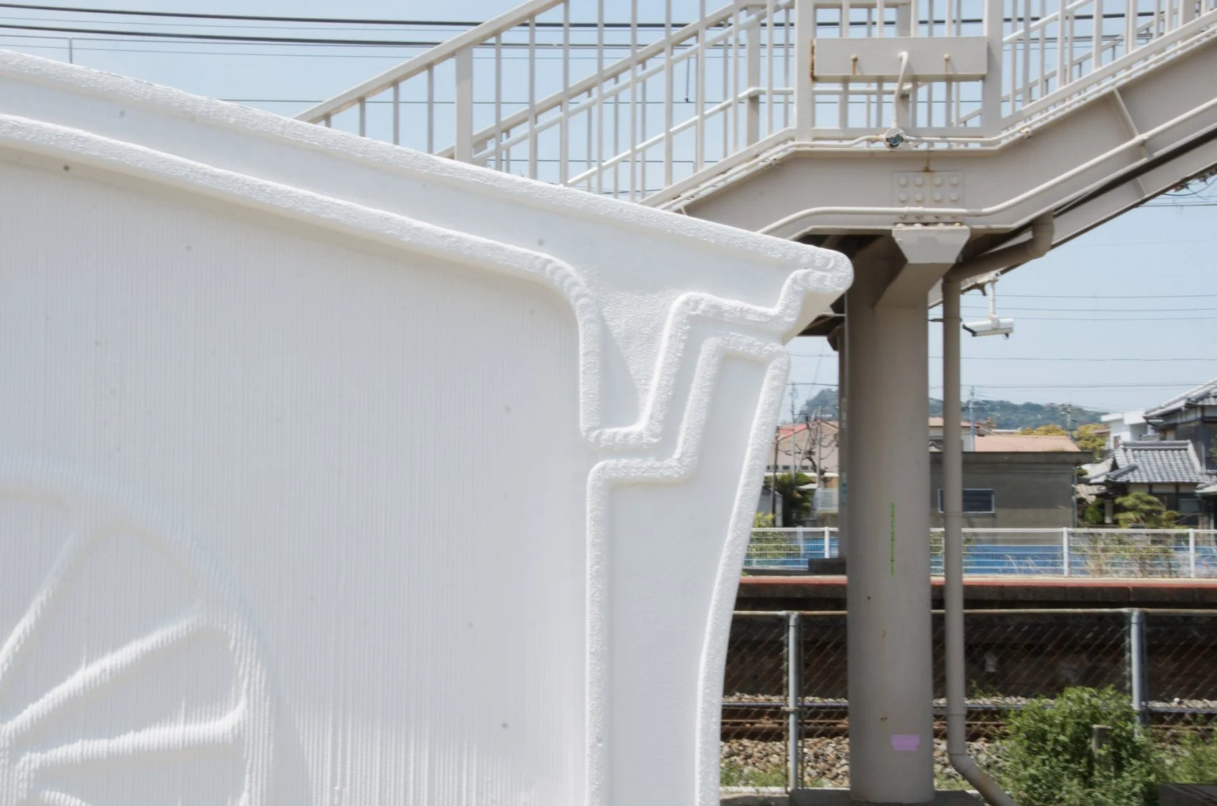 Az állomás a 3D-nyomtatott házgyártó Serendix és a Neuob építészeti stúdió munkája. Négy 3D-nyomtatott habarcsdarabból készült, amelyeket a helyszínen kinyomtattak, és az összeszerelés előtt betonnal töltötték meg, megerősítés céljából. A végső épület alapterülete alig több, mint 100 négyzetláb, és egy régebbi fából készült menedékhelyet vált fel a japán Hatsushima állomáson Oszaka mellett. Míg a homlokzat a helyszínen van, a teljes szerkezet még folyamatban van, mivel a hivatalos júliusi megnyitó előtt még jegyautomaták és közlekedési kártyaolvasók felszerelése szükséges.