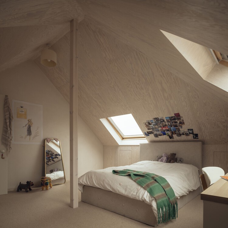 A ház új arculatának középpontja a hátsó, fűrészfogas tetőforma, amely a régi toldalék tetőgeometriájából merít ihletet. A kettős, ellenirányú tetőlejtés drámai, mégis harmonikus sziluettet ad az épületnek. A tetőbe integrált felülvilágítók és az ikonikus, kör alakú nyugati ablak természetes fénnyel árasztják el a belső tereket, miközben vizuális kapcsolatot teremtenek a kerttel. Olvass tovább! Kattints ide!