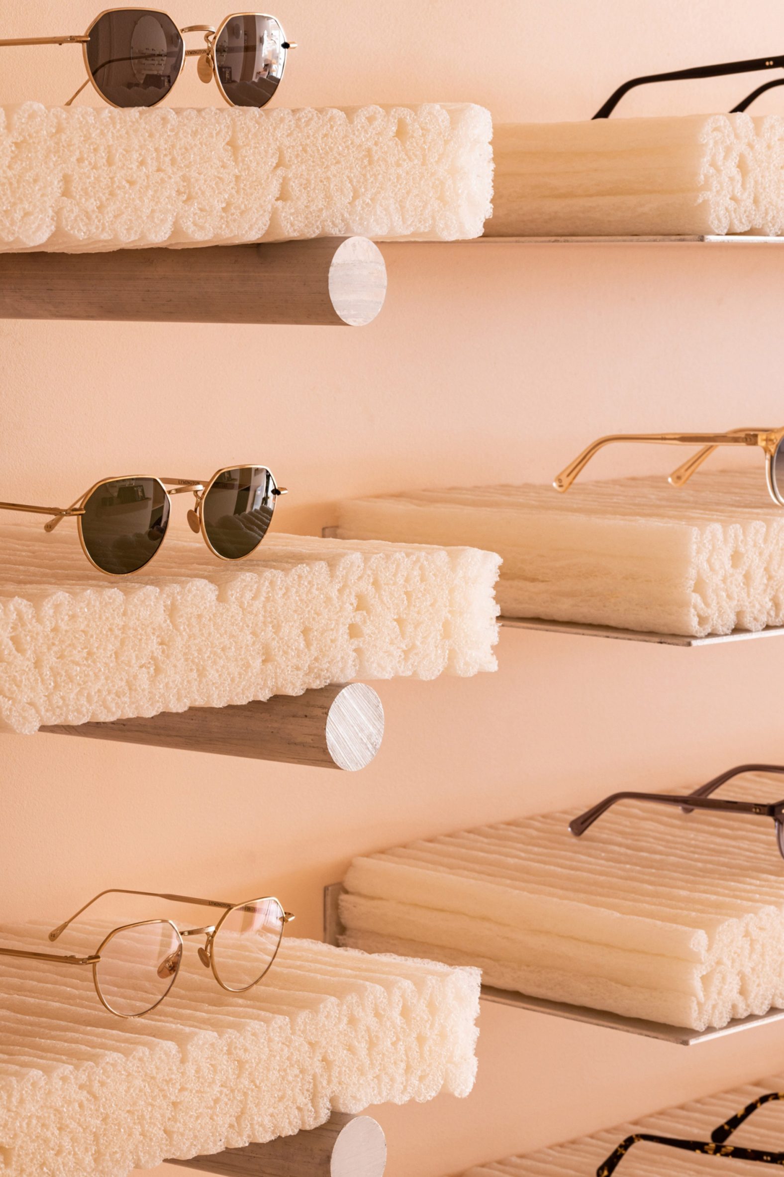 A koncepció középpontjában a mulandóság és az újrahasznosíthatóság áll. A polcok kukoricakeményítő-habból készültek, amelyek idővel akár vízben is feloldhatók, míg a micéliumból formált elemek szó szerint „élő” anyagokból születtek. Ez az üzlet nem örökkévalóságra épít – hanem arra, hogy bármikor szétszedhető, újraértelmezhető, vagy visszaadható a természetnek.