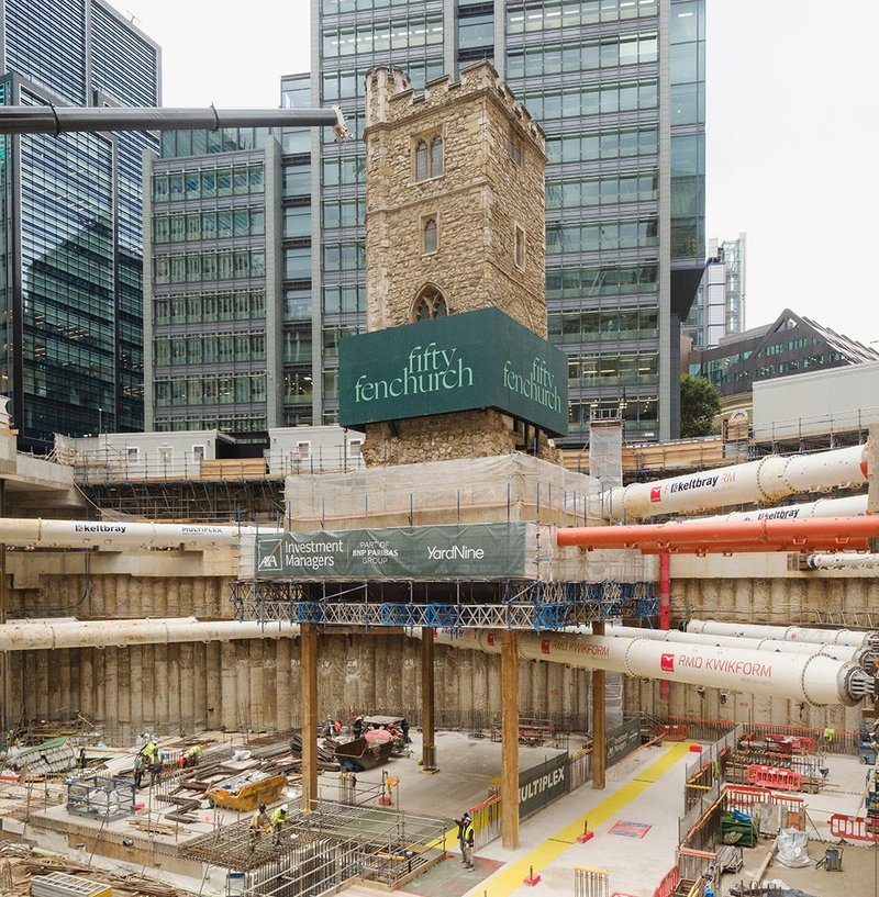 London belvárosában egy olyan építészeti és mérnöki műhelymunka zajlik, amely egyszerre tiszteletadás a múlt iránt és jövőbe mutató fejlesztés. Egy 700 éves középkori templomtornyot úgy emeltek át, hogy négy masszív acéloszlop tartja alá — miközben földmunkák folynak alatta egy modern felhőkarcoló építésénél.