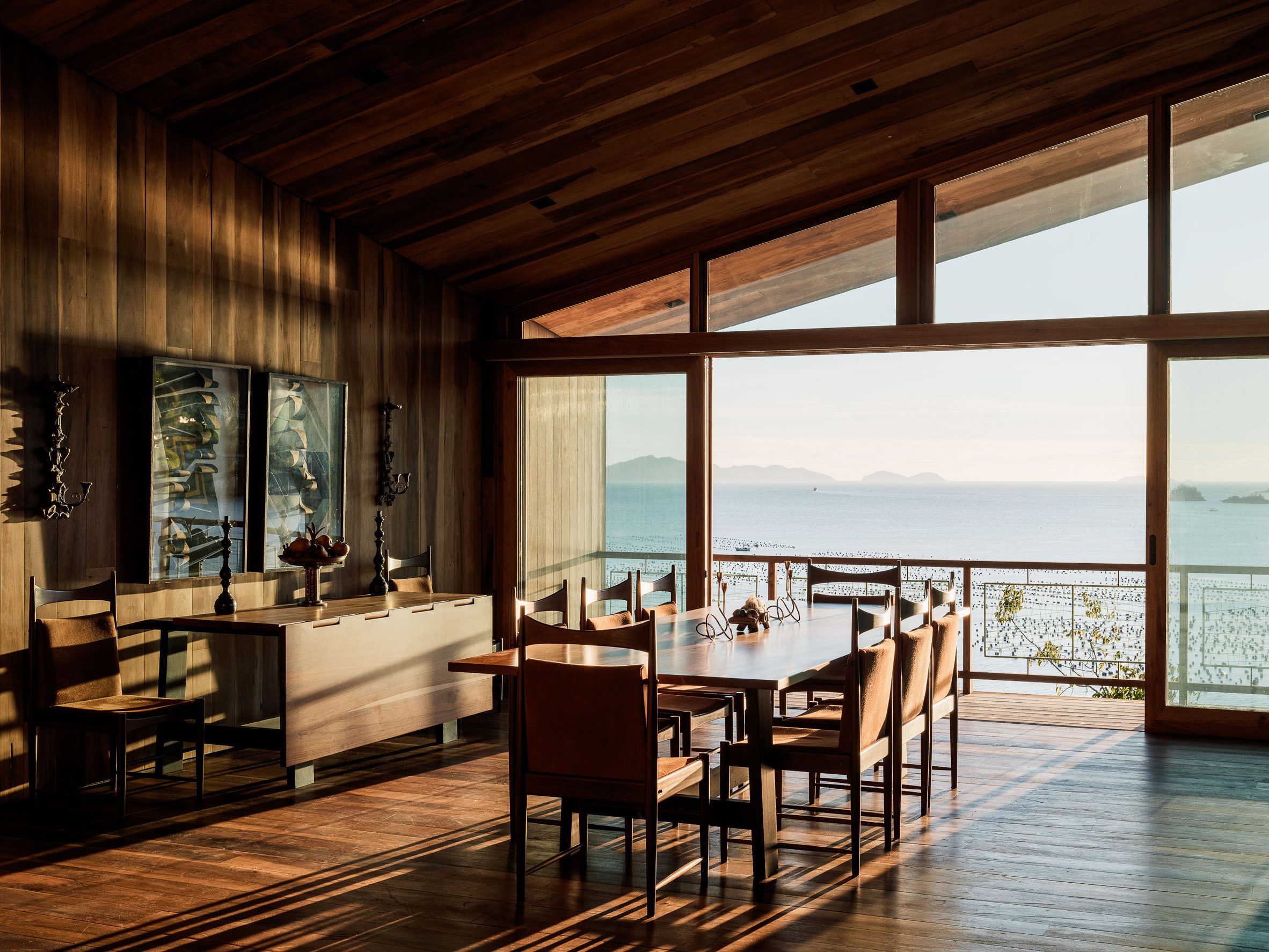 Az épület formavilága a meredek, sziklás domboldalból „kinövő”, egymásra rétegzett épületrészekből áll, amelyek kagylószerűen nyílnak az óceán felé. A tetők tájolása maximalizálja a napenergia-hasznosítást, a mély ereszek árnyékolnak, a nagy üvegfelületek pedig befogják a tengeri szellőt – így a ház passzív eszközökkel reagál a trópusi klímára. A látvány egyszerre nyers és elegáns: az egyik oldalon panorámás vízfelület, a másikon trópusi kertek és monumentális sziklák keretezik a tereket.