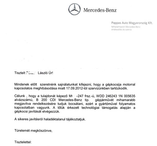 László joggal gondolta, hogy a levelére egy korrekt választ kap, hiszen Ő megvette ezt az autót több mint 9 millió forintért, melyre garanciát is adtak, de a garancia nem azt jelenti, ha baj van akkor tesztszerelők veszik kezelésbe az autót és elkezdenek cserélgetni rajta ezt-azt.