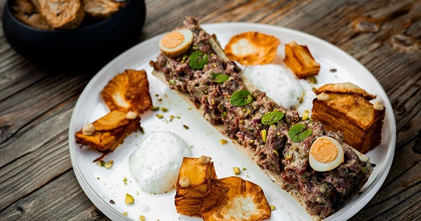 Kardos Gábor elmondta, hogy a bivalytatár zalaköveskúti bivalyhúsból készül, burgonygratinnal, tormahabbal, zellerropogóssal, szardellával, kapribogyóval, kovászos uborkával és házi majonézzel tálalják.