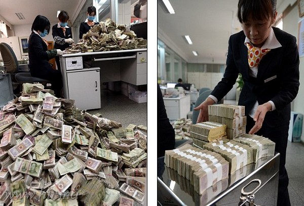 Banki ügyintézők egy halom pénz válogatnak és pakolnak össze. Mr Cui, az ügyfél, több, mint 6 hónap alatt gyűjtötte össze a 162.000 yuant, átszámítva 5.753.000 forintot.