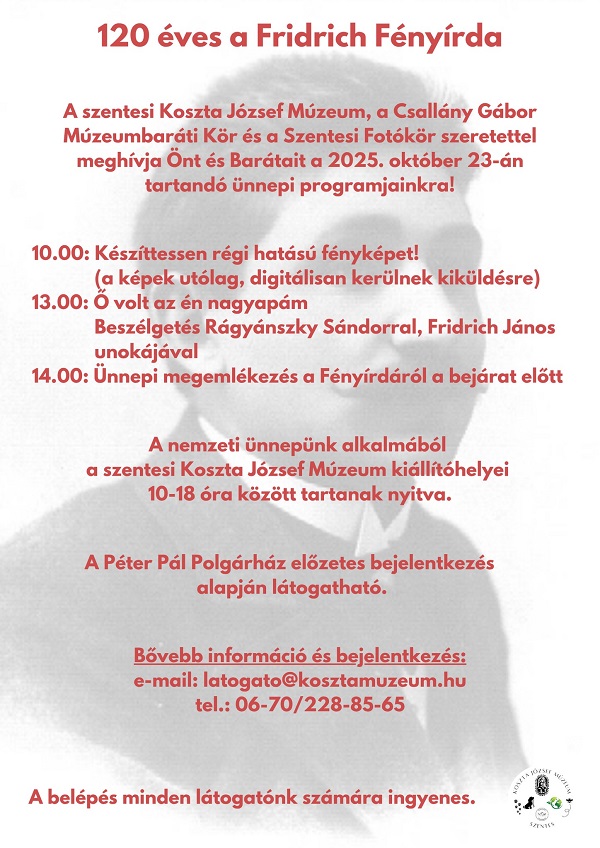 A százhúsz éves Fridrich Fényírdát ünneplik csütörtökön Szentesen. Az ipartörténeti bemutatóhelyen korabeli stílusú fotográfiákat is készíttethetnek magukról az érdeklődők - tájékoztatta Irsai Farkas László, a Koszta József Múzeum igazgatója kedden az MTI-t.