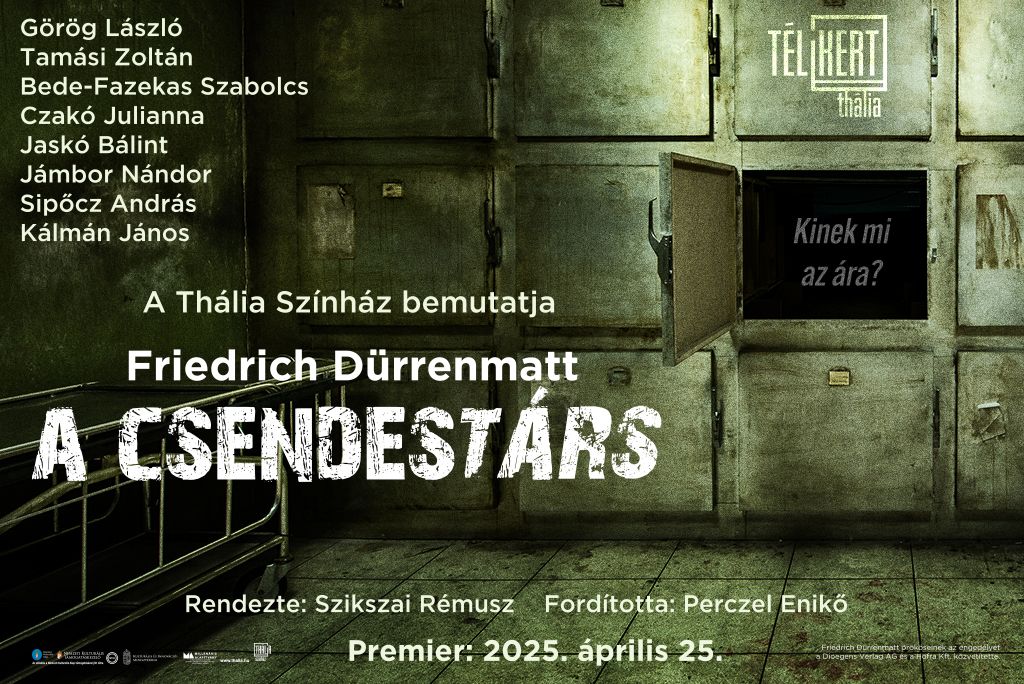 A Thália Színházban április 25-én, pénteken tartják az évad utolsó premierjét: Friedrich Dürrenmatt ritkán játszott tragikomédiájával, A csendestárssal bővül a teátrum repertoárja. Az új produkciót Szikszai Rémusz rendezésében mutatják be a Télikert színpadán.