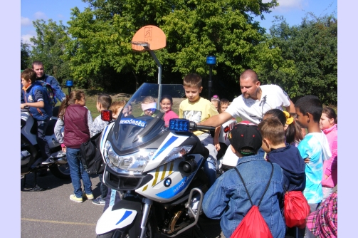 Rendőrök, tűzoltók és mentők várták a Sarkadi Általános Iskola Gyulai úti intézményének udvarán az óvodásokat, iskolásokat 2013. szeptember 20-án. A nyílt napon dr. Polyák Zsolt r.