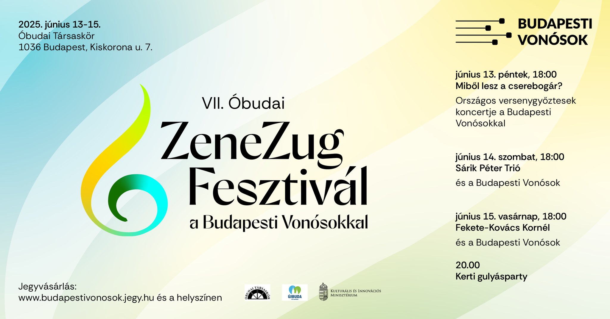 Június 13. és 15. között rendezik meg a VII. Óbudai ZeneZug Fesztivált az Óbudai Társaskörben, ahol versenygyőztes zeneiskolások, a Sárik Péter Trió és Fekete-Kovács Kornél lép fel az Óbudai Vonósokkal.